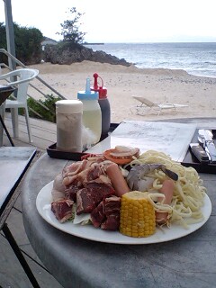 暗くなる前から、海に突き出したテラス席でおいし〜くいただいた。