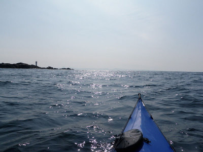 朝日が波にキラキラ輝き、その先の霞の中に房総半島が見える。