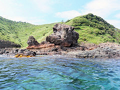松ヶ崎を越え、先に見える垂直に切り立った大頭崎(おおかしらざき)を回り込んだら、島津島キャンプ場があるはず。