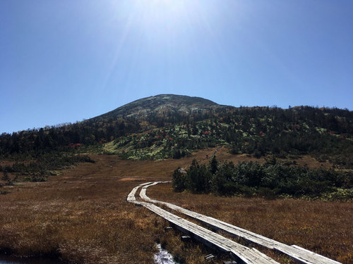 思ったよりもぬかるんでいない森の中を1時間半ほど歩くと、目の前に燧ヶ岳が現れた。