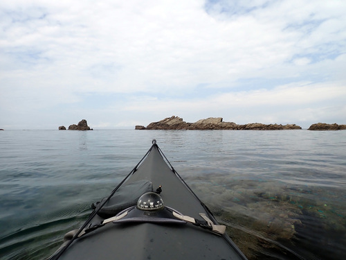 帰り道、出艇地の防波堤の切れ目を探していたら、いきなり岩だらけの浅い場所に出くわした。