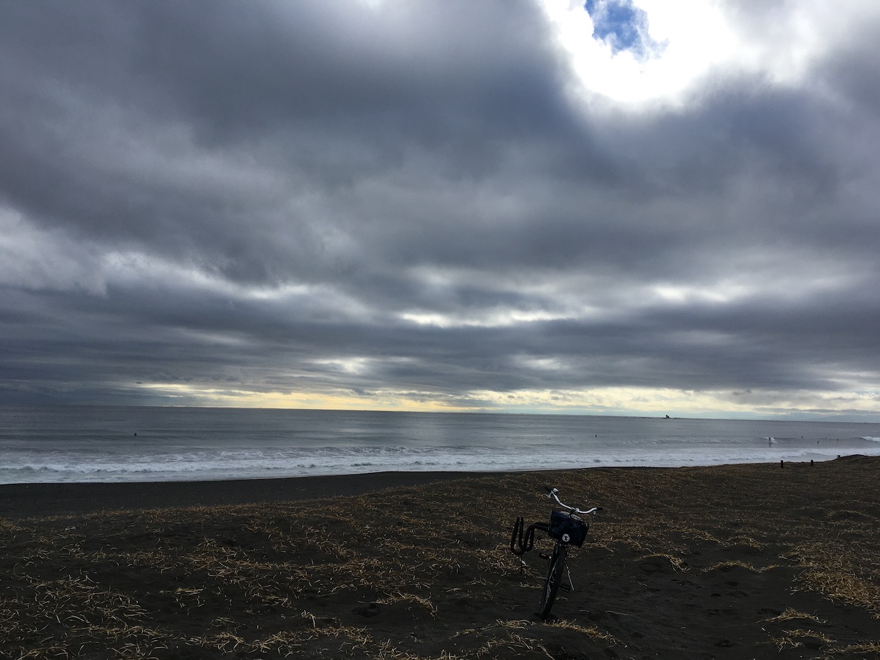茅ヶ崎のサーフポイントは絶好の波が入っていて、サーフボードを運べる専用の自転車で乗りつけた地元のサーファー達が見事なライディングを決めていた。