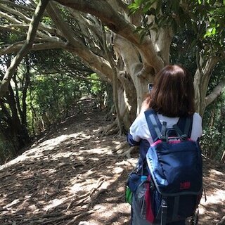 テーマパークにある偽物の木みたいな「マテバシイ」の写真を撮るユキちゃん。