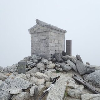 日本百高山の一つである駒津峰の手前で振り向くと、歩いてきた双子山の向こうにある仙丈ヶ岳が雲の中に隠れてしまっていた。標高2,752メートルの駒津峰に到着。