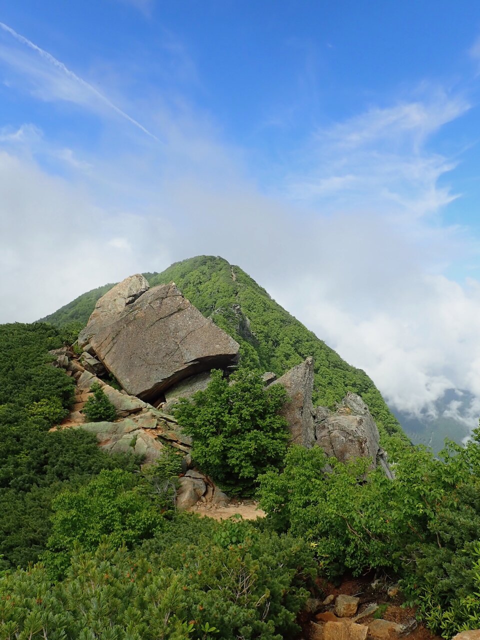 振り返って見た六方石は、鼻が低いモアイ像が寝っ転がっているように見える。頂上まで残り1時間の場所に到着。