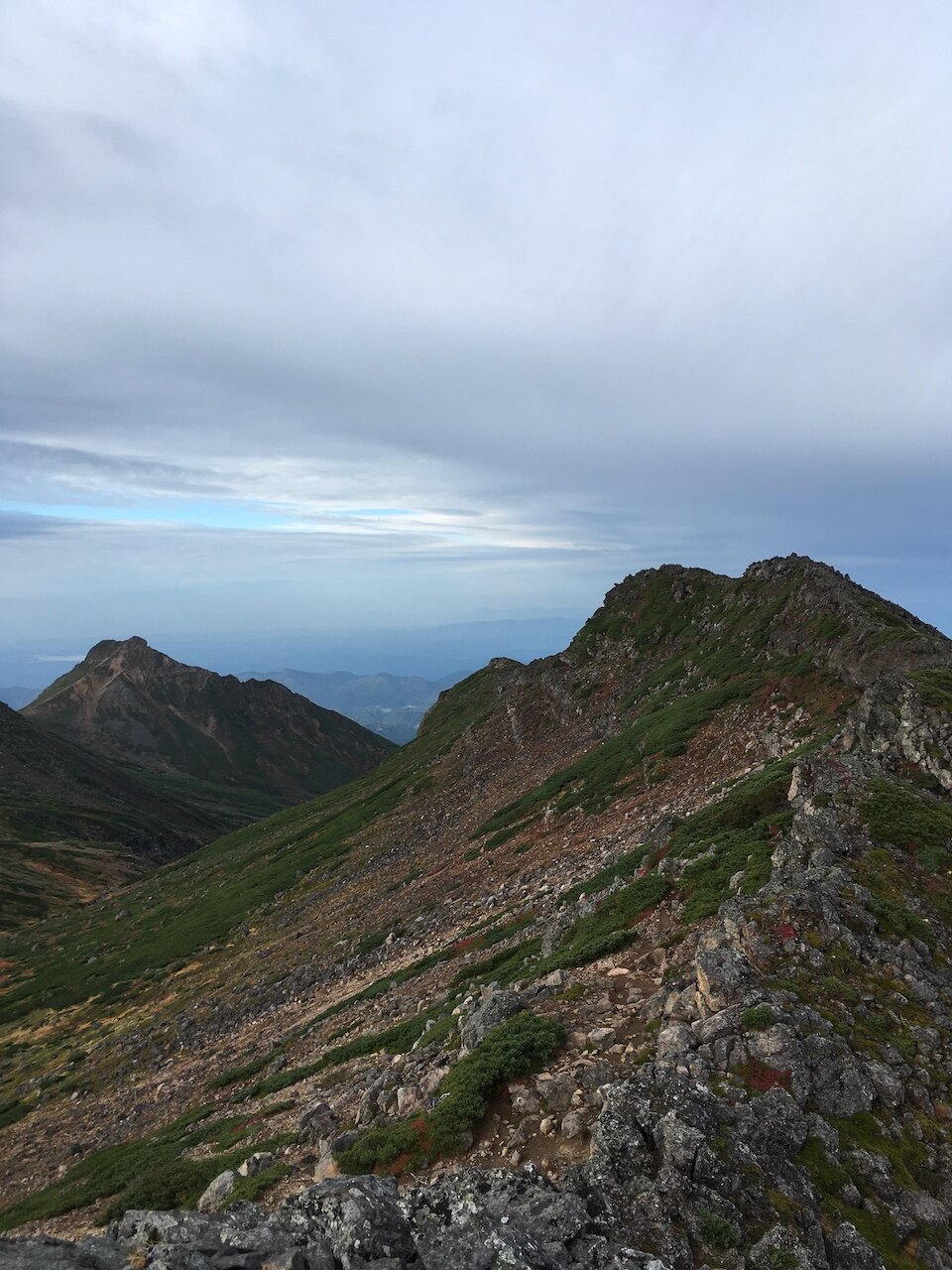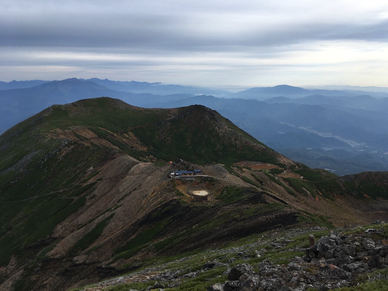 摩利支天乗越の手前で、五の池小屋方向を見る。