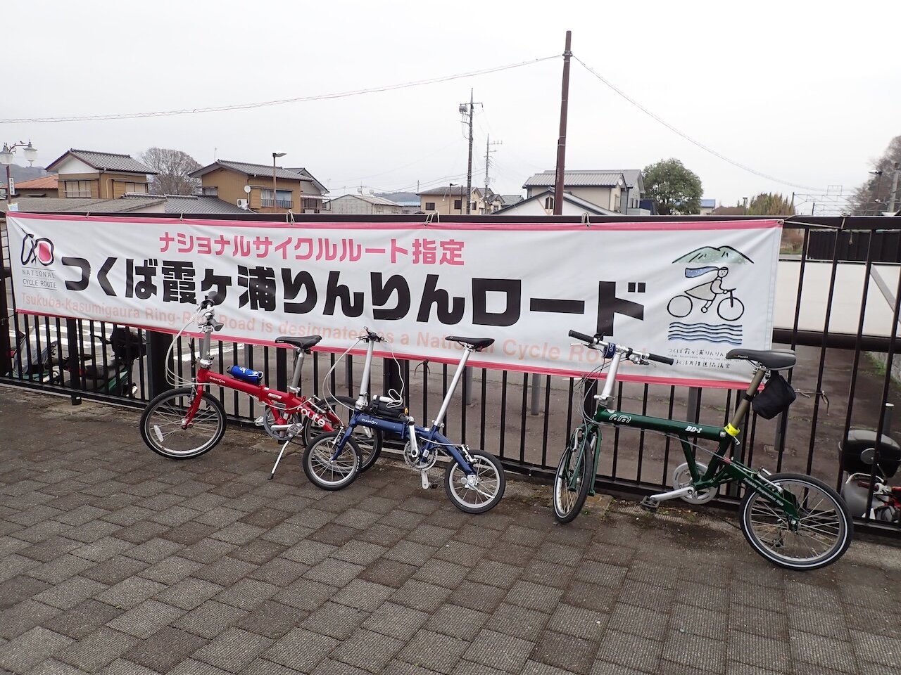 バーディ君の希望で駅前の垂れ幕の前に自転車を並べ、記念撮影した。