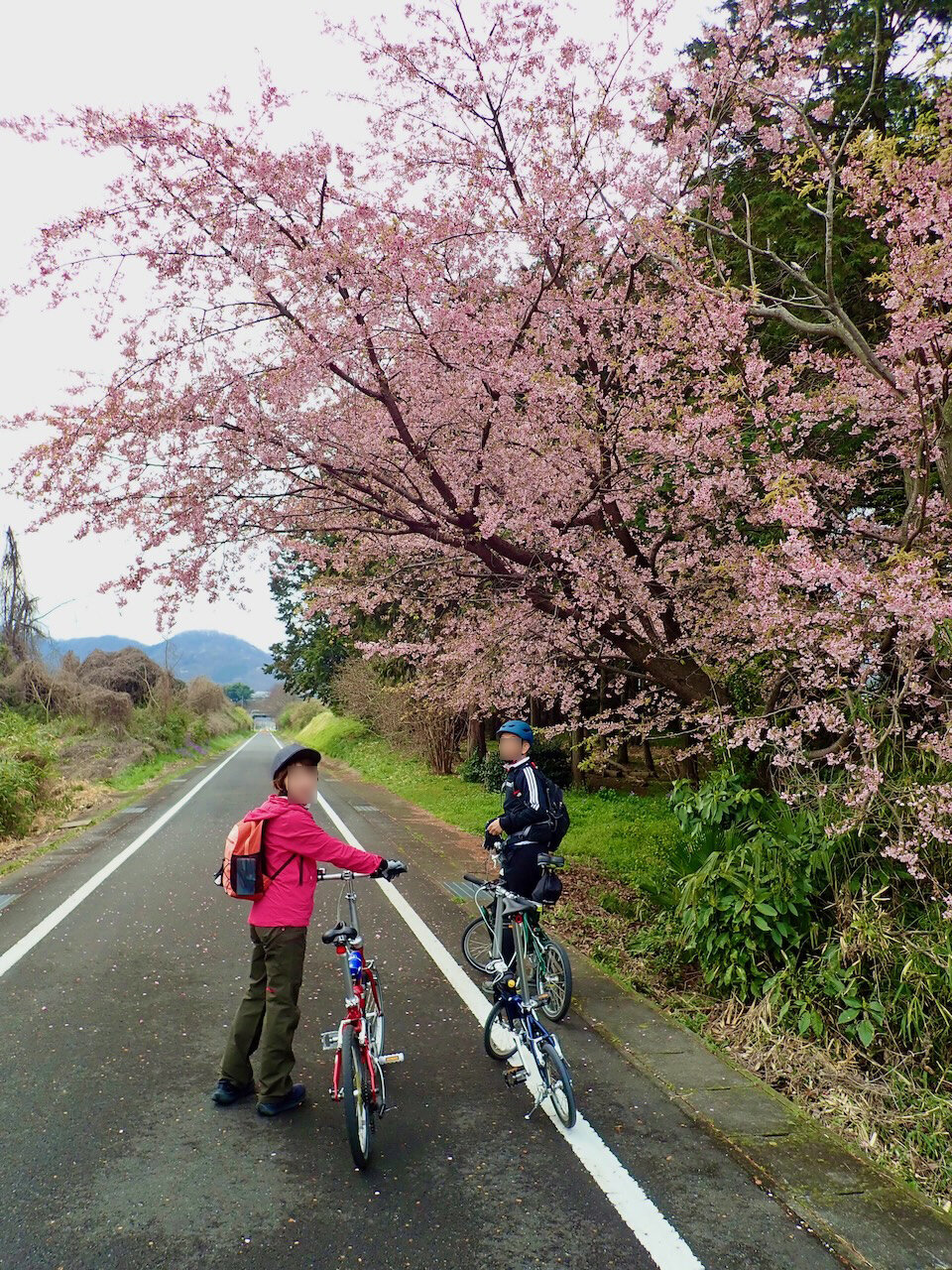 スタートして5分後、最初の桜の下で記念写真をパチリ。