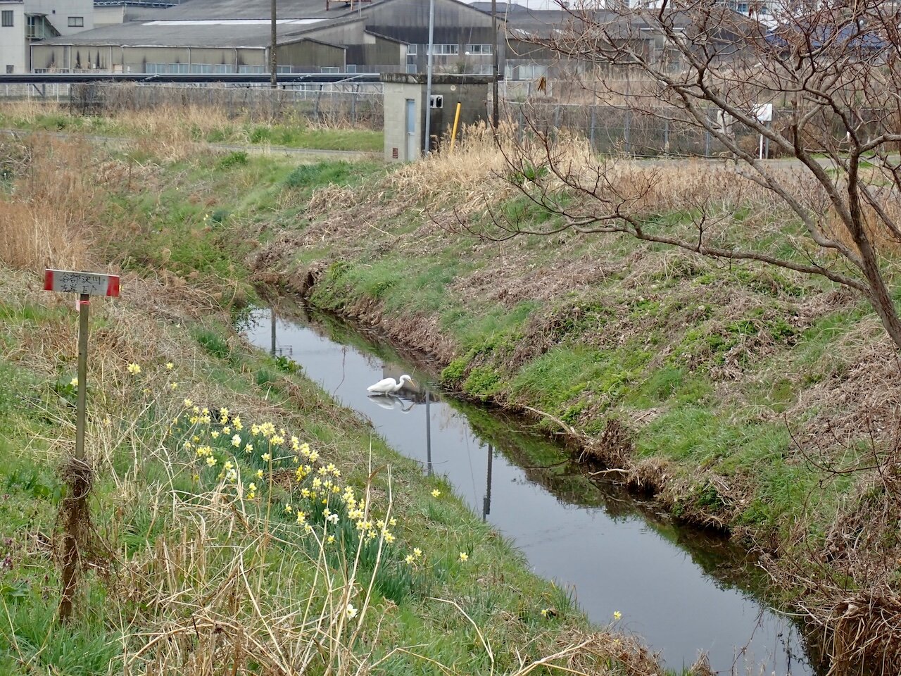 白サギを眺めているおじさんがいたので、私も自転車を降りて一緒に観察。
